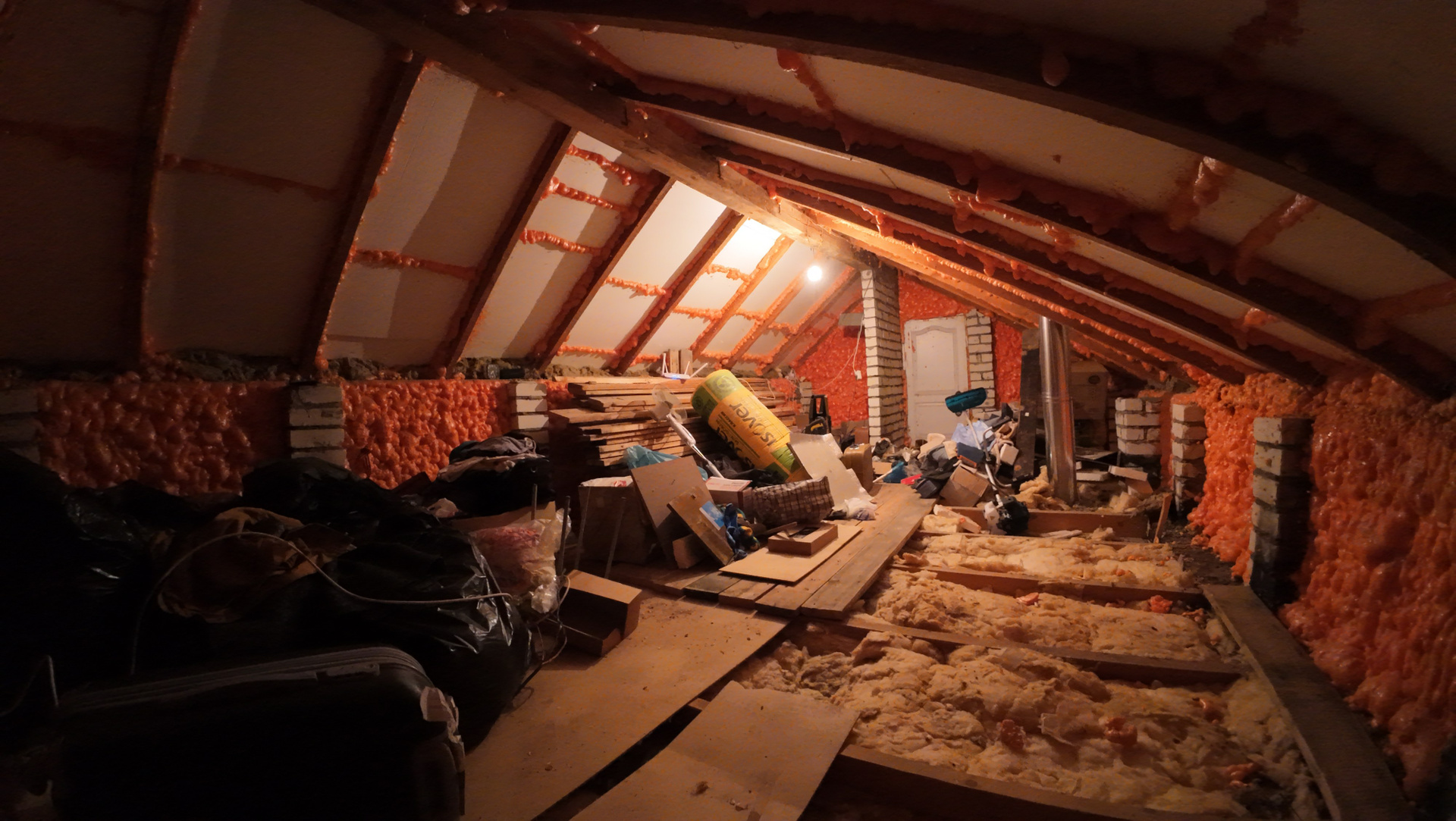- остались материалы от бывшего хозяина дома — доски, несколько рулонов утеплителя